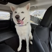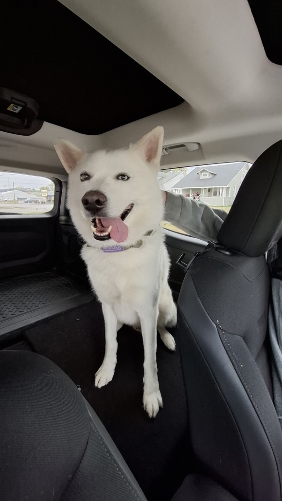 Husky, one eye blue and the other bigger and brown. Very friendly with a Zoomies nylon collar. I need him to respond to a name you call him.