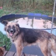 German shepherd long haired has shed out for summer possibly pregnant or recently had her litter, could cause her to be aggressive. Small spot of white on nose and floppy ears. Blue collar