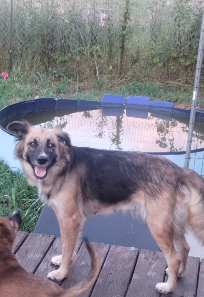 German shepherd long haired has shed out for summer possibly pregnant or recently had her litter, could cause her to be aggressive. Small spot of white on nose and floppy ears. Blue collar