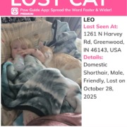 Lost Cat, Alert #92712 Leo missing near Shelbyville and Mitthoeffer, Greenwood46143