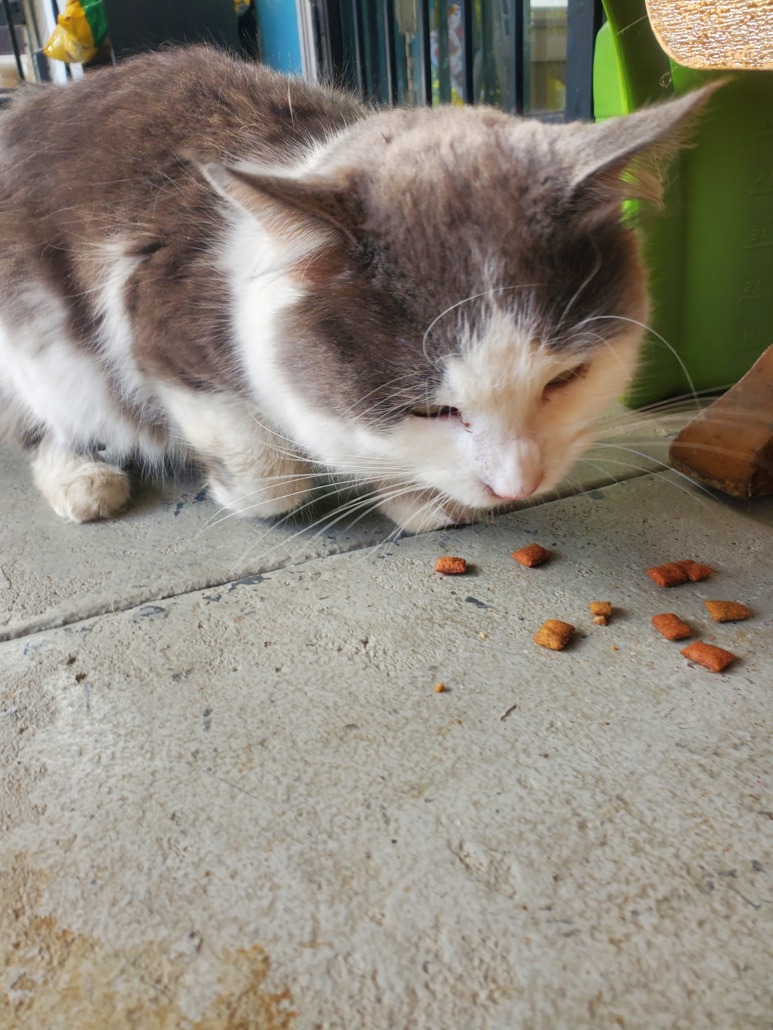 Grey and white, long hair. Super friendly. Show proof of ownership please.