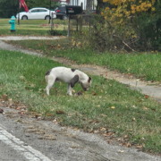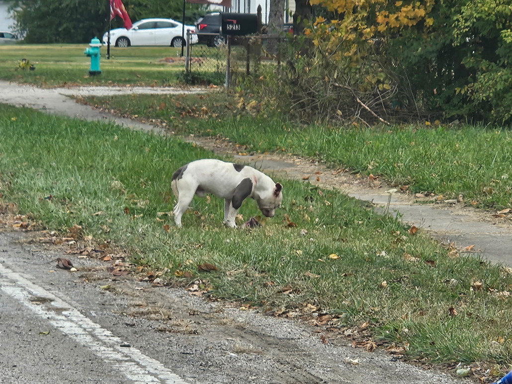 White Pitty with gray spots, looks injured and eating a dead raccoon in the road, at risk of being hit by cars