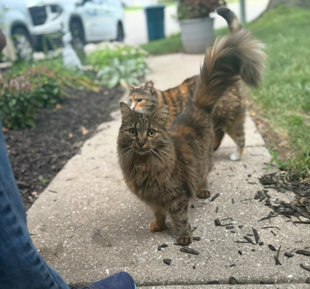 Kitty is a stray that we have fed for over a year and she never travels very far. She is fixed and has an ear tip. She is a long haired tabby with some orange like a calico.