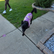 Male Black dog with flower sweater. Brown eyes. Proof of ownership is required.