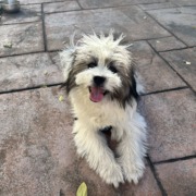 Small white w tan and black on head and hind quarters Shih Tzu?.