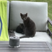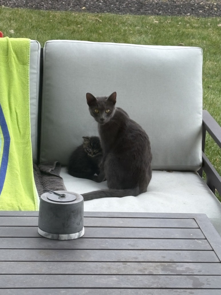 Young female cat found in July that I’ve been feeding. She now has 1 kitten, estimated to be about 4 weeks old.