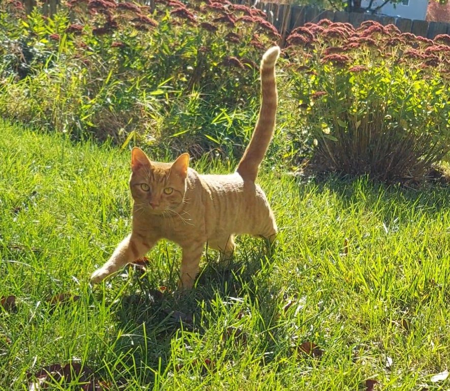 This is a young unneutered male orange tabby. He is skittish but friendly and very comfortable being outside.