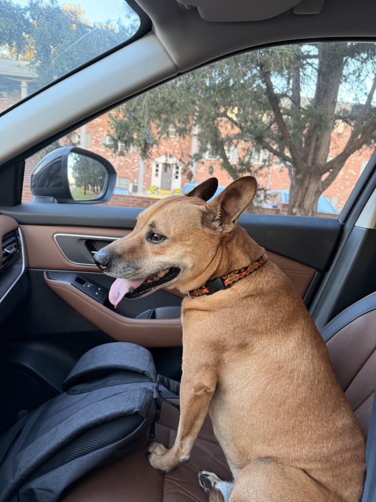 Very docile and came right up to my car during the morning rush hour, he looks very healthy, loved and cared for. Light brown/tan and has spots on his tongue like maybe a chow mix. Wearing a collar, that’s red black and yellow in design, no tag on collar