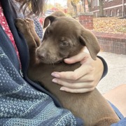 He has a little collar on. He’s a very sweet chocolate lab. He’s young, just a small puppy. Proof of ownership is required: you can show a photo or describe the collar.