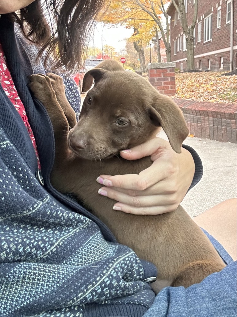 He has a little collar on. He’s a very sweet chocolate lab. He’s young, just a small puppy. Proof of ownership is required: you can show a photo or describe the collar.