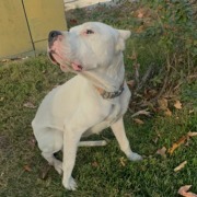 White dog, orange/tan carharrt collar. Proof of ownership required.