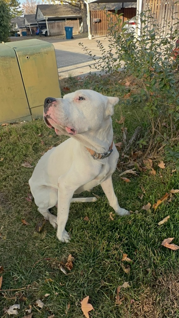 White dog, orange/tan carharrt collar. Proof of ownership required.
