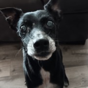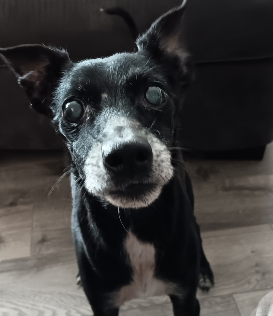 Henry is a small/medium-sized terrier mix. He’s black with a white snout, stomach, and paws. He has long legs and a small bare spot on his back from allergies. He’s wearing a red collar with tags. He is 12+ years old and has trouble seeing and hearing. He is very sweet but might be frightened, because he hates being outside.