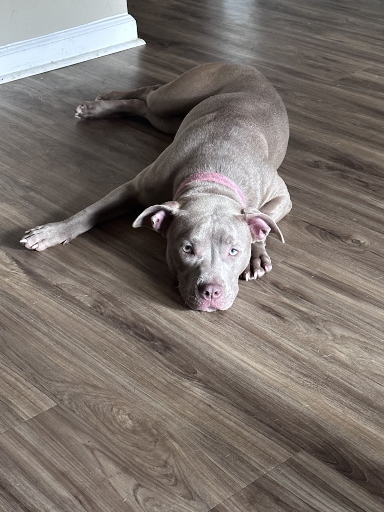 She’s a grey bully. She’s so sweet & playful. She ran out of the backyard with our other dog Xen.