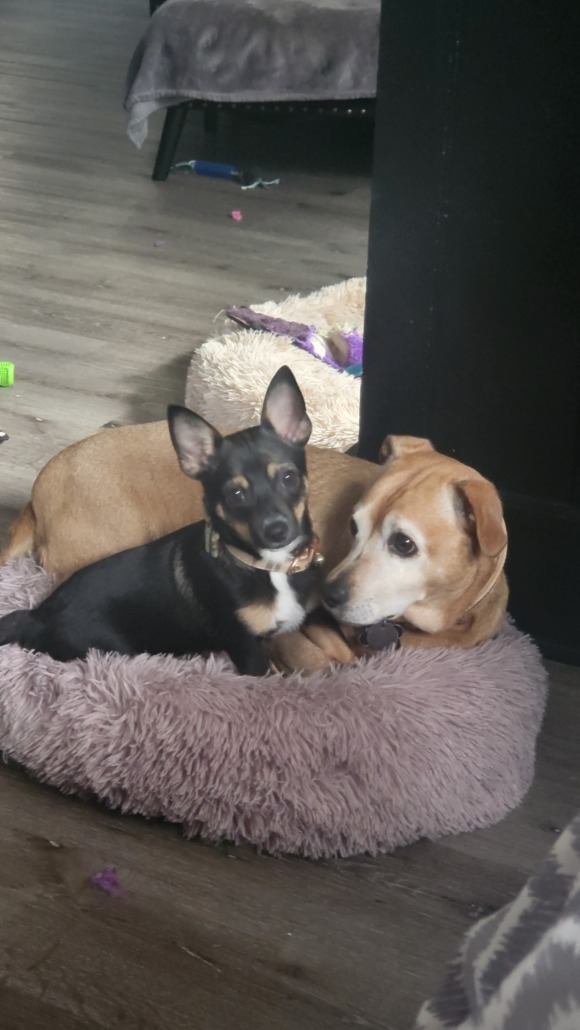 2 years dear hear chi. His name is Tobi he has a white chest. He is very skittish around other people. He does not have on a collar he got through the fence.