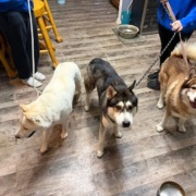 3 Huskys, one white, one red, one black