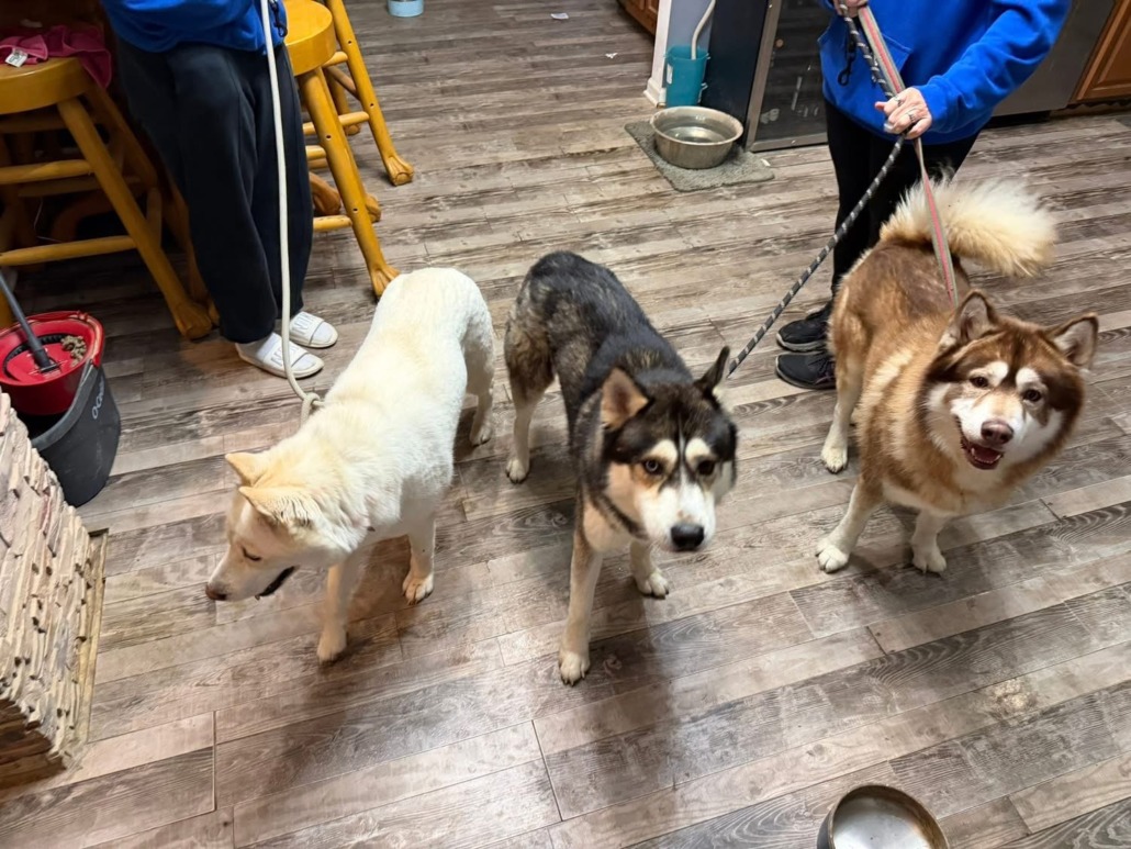 3 Huskys, one white, one red, one black