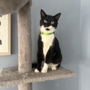 Chloe will have a green collar with a bell. She is actually very friendly and may wonder into your garage. She has green eyes, white whiskers. Black nose and chin-tuxedo. Likes to give aggressive head boops and rolling in dirt. If you brought her in, she likes to drink from the kitchen sink.