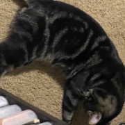 Black/dark grey with grey striping patterns, yellowish/green eyes. Beautiful and friendly. Proof of ownership is required.