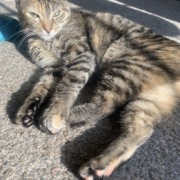 Bella is a very small cat. She is grey, black, and white and looks like a kitten but is full grown.
