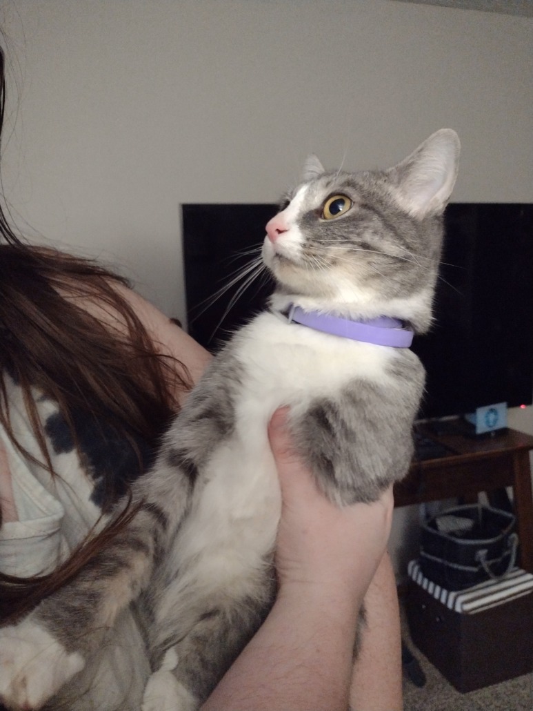 Grey and white tabby. Found with a purple flea collar and smelling of flea treatment. Looks like she might have been dumped in our apartment hallway and escaped from the bag she was tied in.