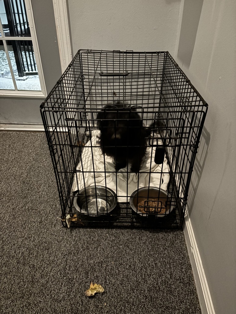 This sweet dog was found in the hallway of our apartment building, in a crate with food but no water. I can’t take the dog in because we have a 16 year old cat that gets easily stressed out around dogs. Proof of ownership is required.