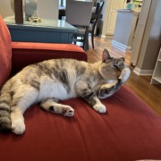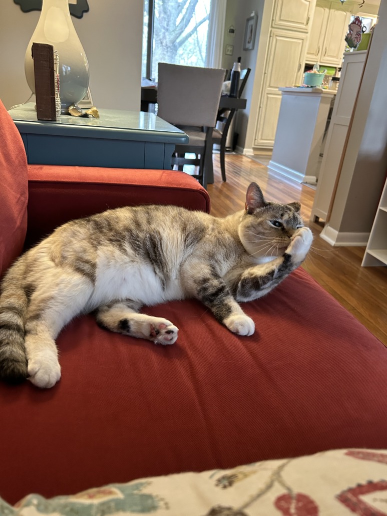 white with gray and tan splotches, bright blue eyes, really big belly but harder to tell when she’s walking, dark stripes on the end of her tail