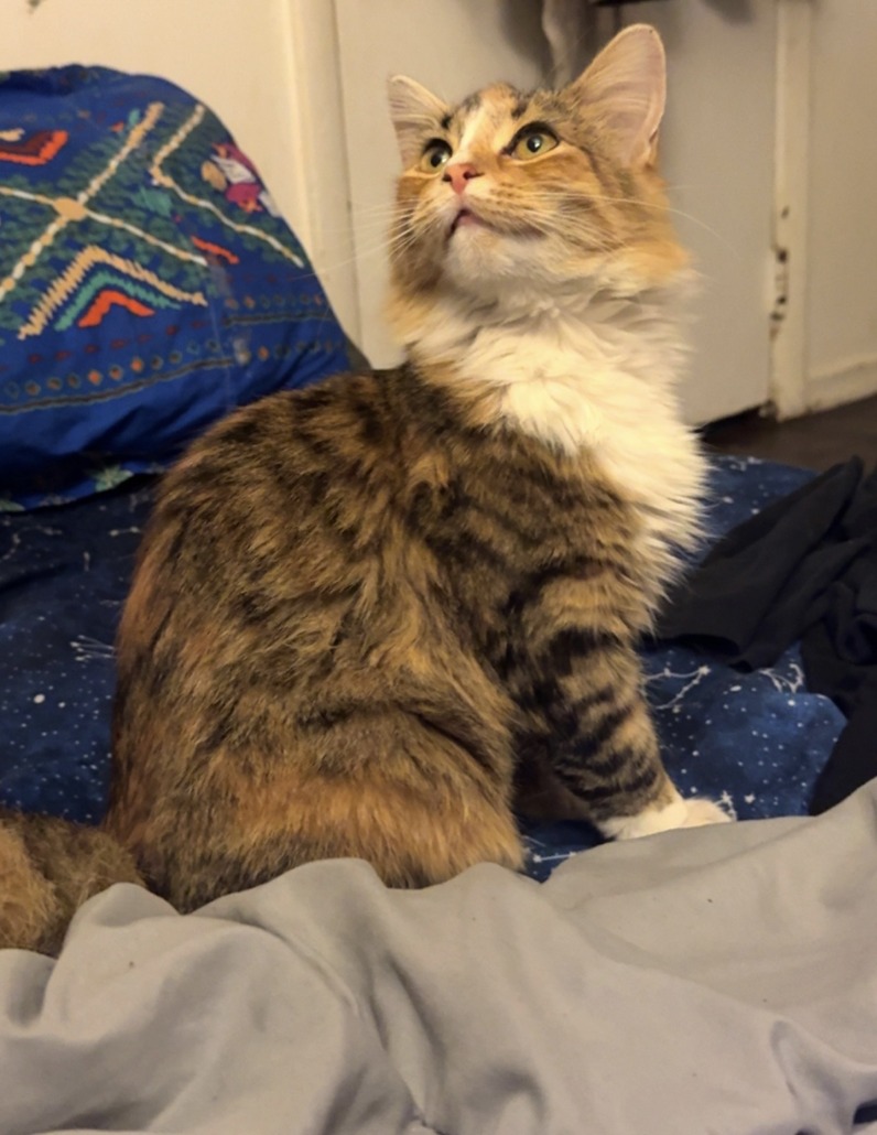 Female cat with long hair orange,black tan and white fur.