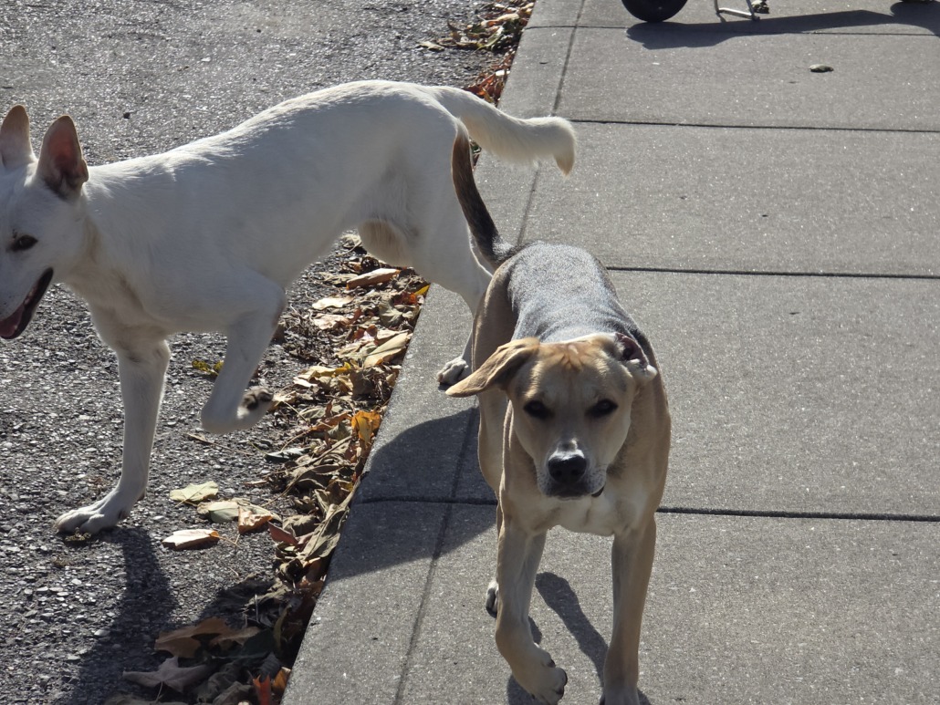 2 dogs traveling together near Spruce & Orange. One white Shepherd, 1 brown and black hound mix. No collars. Seemed friendly and stuck together. Took off down an alley traveling west. Saw again on Orange shortly after this photo.
