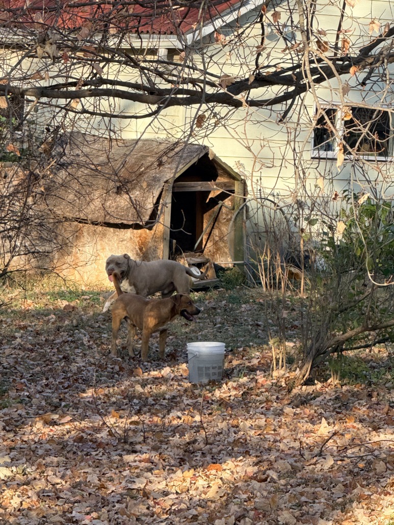 2 large pitbull mixes, no collars, 1 light brown, other was grayish. Traveling together