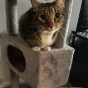 Tabby cat with white chest and white paws. Proof of ownership is required.