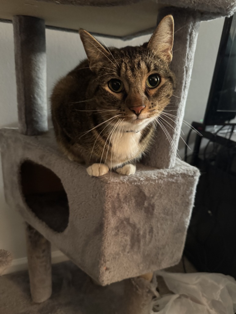 Tabby cat with white chest and white paws. Proof of ownership is required.