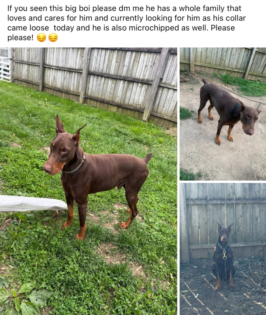 Our dog got out of his collar yesterday afternoon. He is a big brown Doberman. He is super friendly. His name is Bronx.