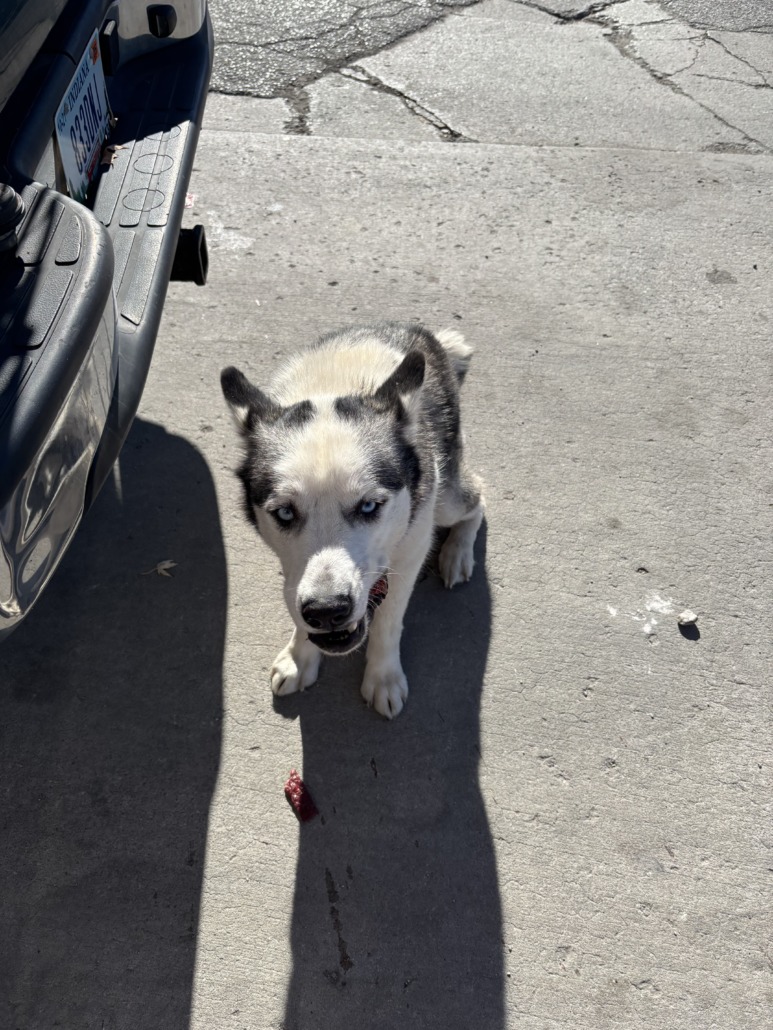 Appears to be a husky. No collar, looks to be very hungry and thirsty. Nails trimmed and teeth are clean. Very skinny and has not been bathed in a while. Very friendly, knows “sit” command and does well on a leash. Not aggressive with food.