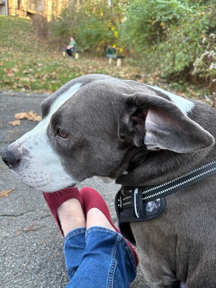Dog was tied to a bike rack and left by a male. Gray and white mix. Has a chip but, no one answers. Proof of ownership required.
