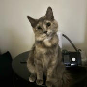Grey and orange tortoise cat, 2 years old. Very friendly but does not like to be picked up. She loves to be pet. Knows her name and will come to you if called.