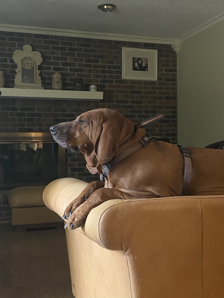 Female fixed Redbone Coonhound. Black harness.