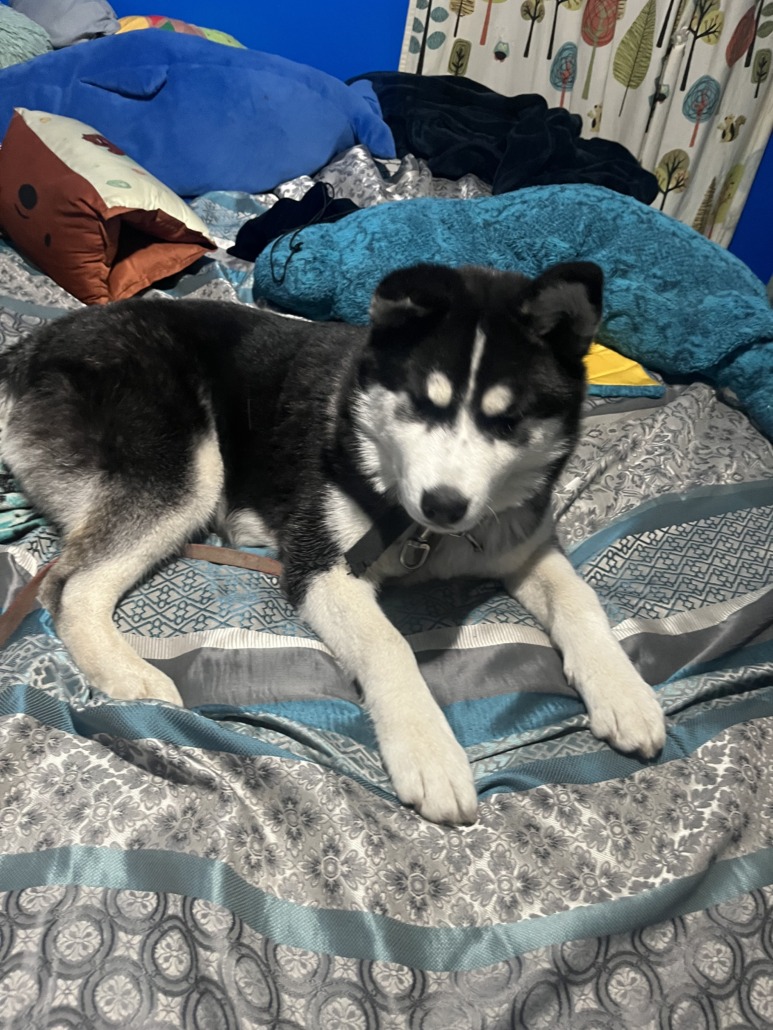 Lola is a black-and-white husky with blue eyes wearing a pink collar. She has a microchip.