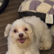 Frankie is a Maltese/poodle mix. Her hair is longer now – more straight. She has grey ears