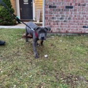 Found with collar, no identifying information. Brown eyes, silver base with brindle markings. Proof of ownership is required.
