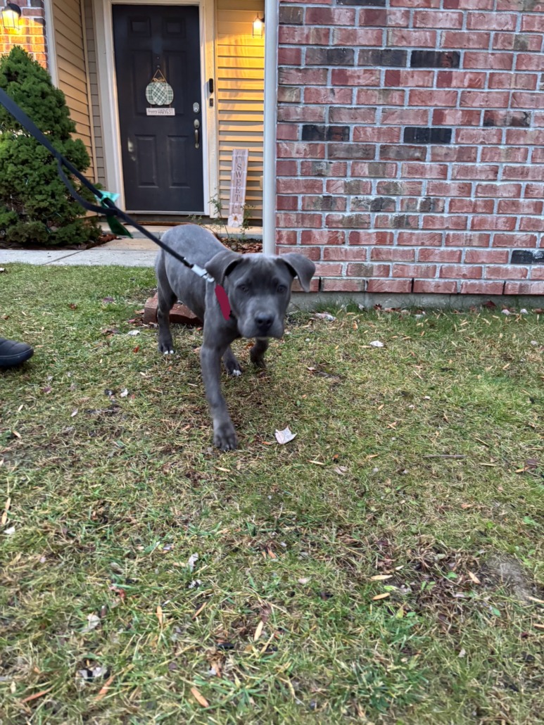 Found with collar, no identifying information. Brown eyes, silver base with brindle markings. Proof of ownership is required.