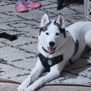 Mostly white husky with a spot of black on one side and black around the ears. Wearing a black collar and harness. They are very curious and will most likely come to you once you grab their attention.