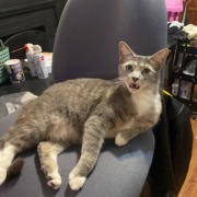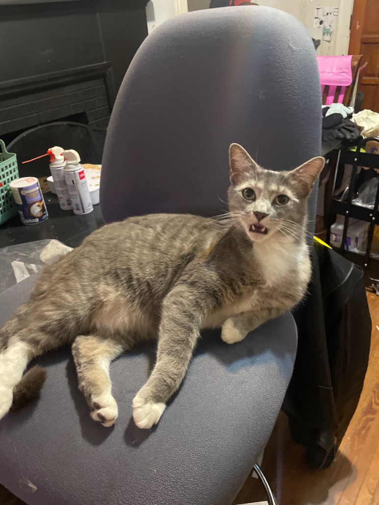Dorian is a gray stripes tabby with a white chest and socks. He has a very tiny, squeaky meow. He’s declawed on his front paws from his previous owners. He’s incredibly friendly and will climb into strangers laps for attention or go onto neighborhood porches to eat other cat’s food. He is very afraid of other cats