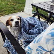 She is an American English Hound mix. She is mainly white but has brownish red spots. She has a heart shaped spot on side, think it’s the left. She is a sweet girl but a bit skiddish.