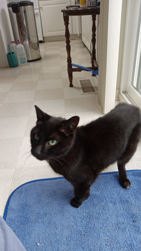 All black female cat with small white locket on chest and with claws intact. Body condition was extremely thin when found. Seems familiar with humans and can use a litterbox. Please provide proof of ownership.