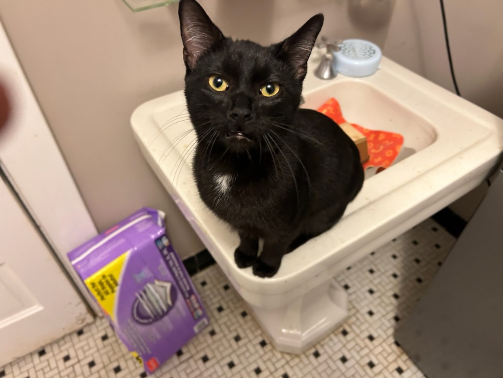 Young black male cat. White spot on chest healthy looking and friendly.