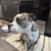 So sweet and well behaved brindle pitbull. She seems to be a bit older and needs to use the restroom a lot.