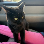 Intact black Male, very sweet, followed us home and then wouldn’t leave our porch. Has a couple white hairs on his back and chest.