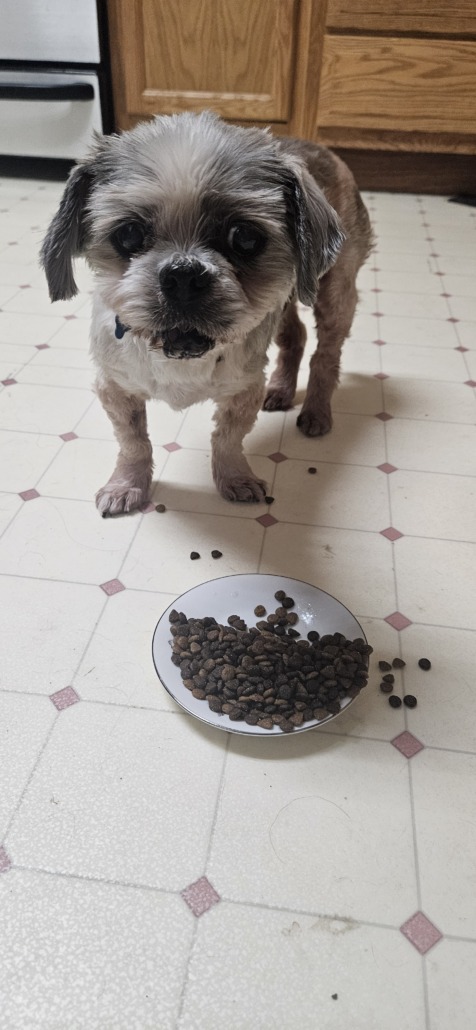 My 18 year old dog got out while I was at work today. He has a sweater on that is black with white ghost dogs on it we are near Thompson and Keystone on Hanover drive. I fear someone has already grabbed him.