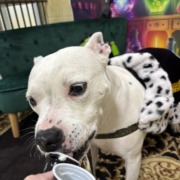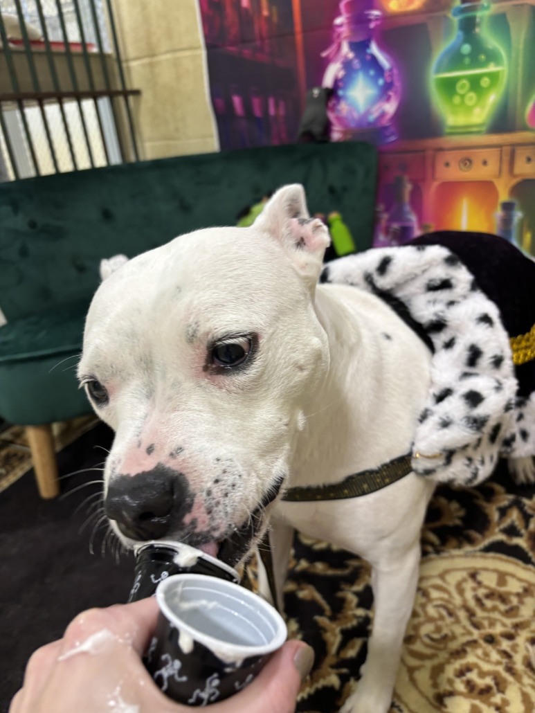 Mainly white with large black spots, one on her side and her bum is mainly black with a white tail tip. She has a small growth under her right armpit/chest area. Perky ears with small spots.